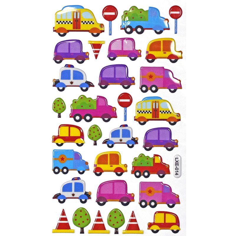 Konvexní nálepky. Vzor: vozidla, dopravní značky. 31 kusů.