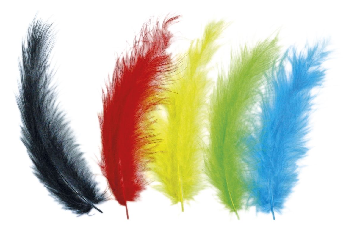 Ozdobné peří, délka 11,8-15 cm, barvy: žlutá, zelená, červená, černá.